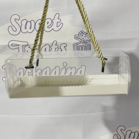 Introducing our elegant Clear Favour Box with a luxurious Gold Rope Handle. This stylish packaging solution is perfect for showcasing delectable treats such as brownies, mithai, mini cheesecakes, truffles, and more.