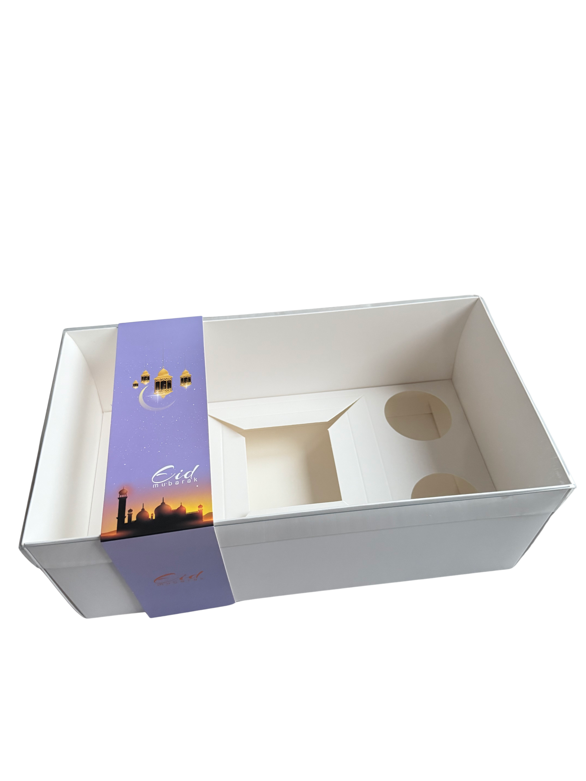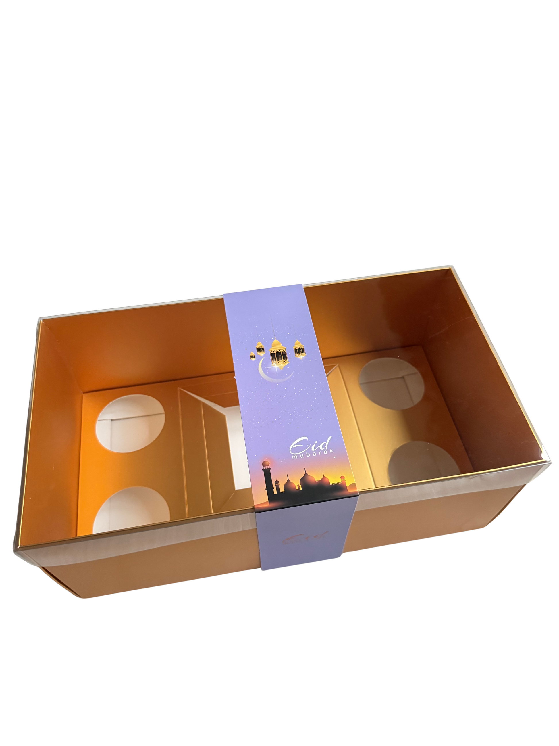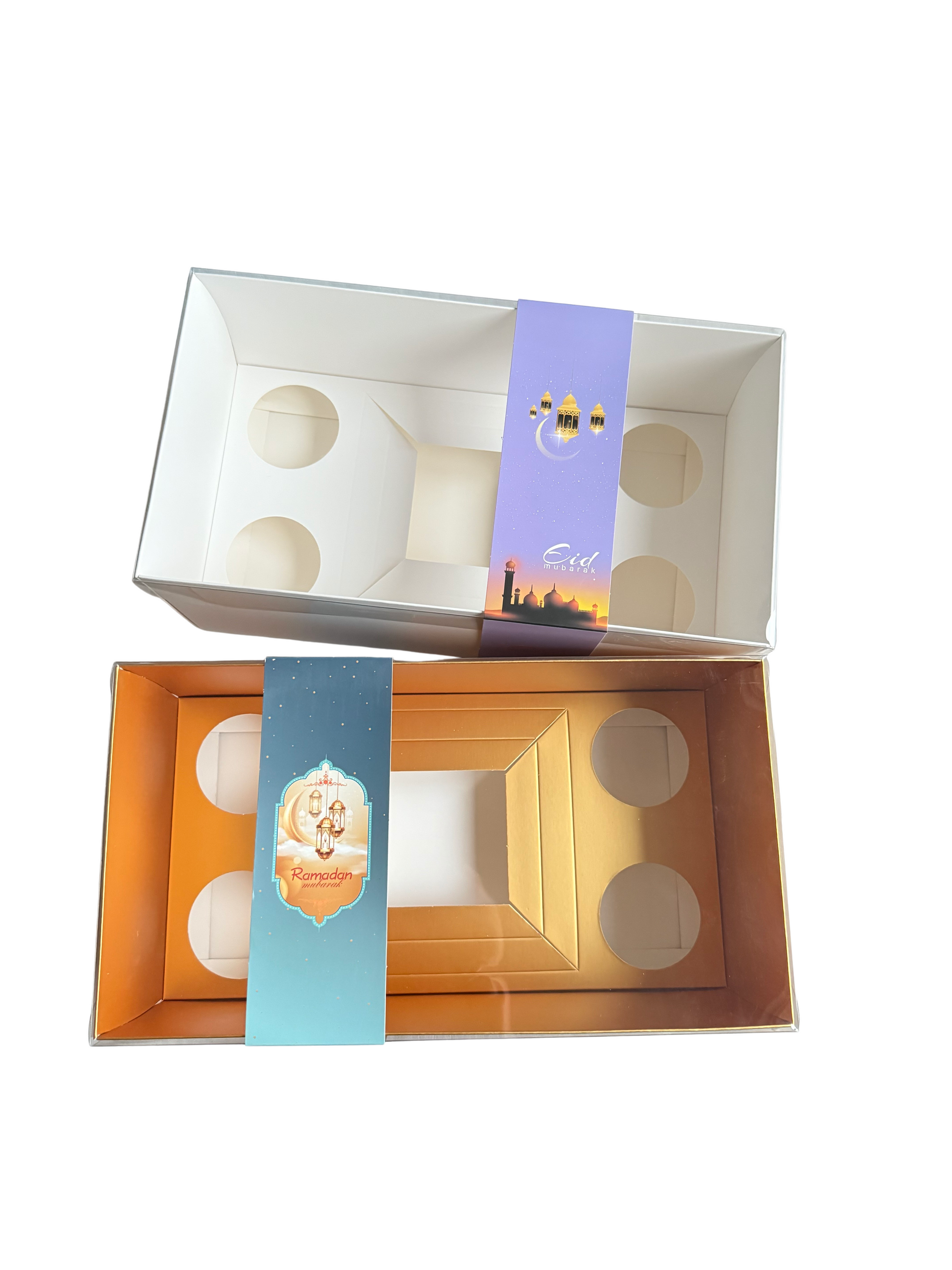 4-Hole Clear Lid Bento Box With Ramadan/Eid Sleeve – Premium Dessert Packaging in White or Gold