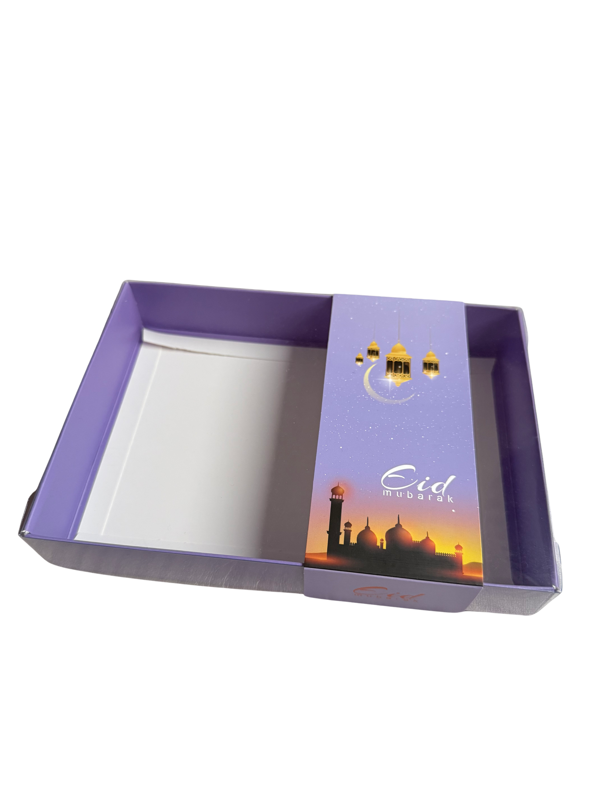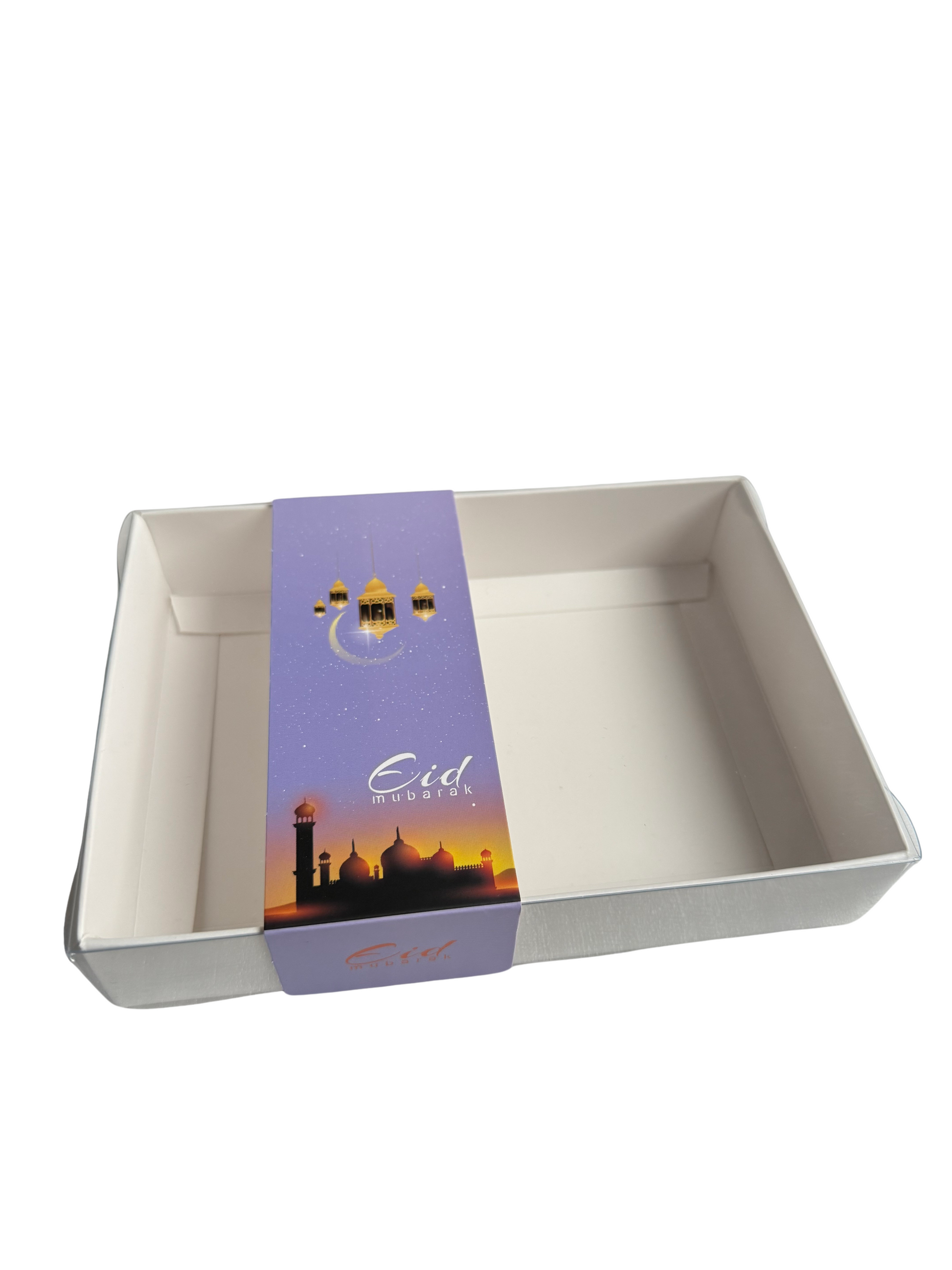 Discover our Clear Lid Box adorned with a Purple Eid Mubarak sleeve 🕌, an exquisite packaging option that adds a touch of sophistication to your festive celebrations.