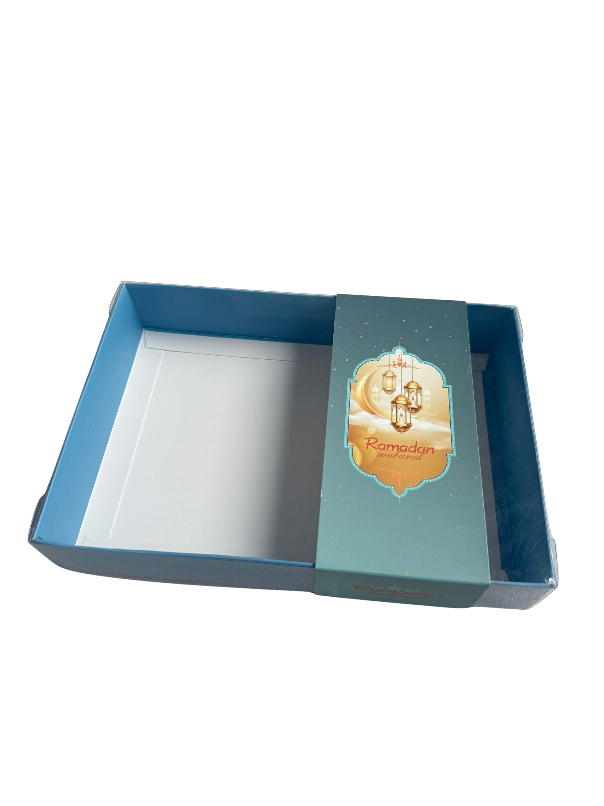 Discover our Clear Lid Box adorned with a Blue Ramadan Mubarak sleeve 🕌, an exquisite packaging option that adds a touch of sophistication to your festive celebrations.