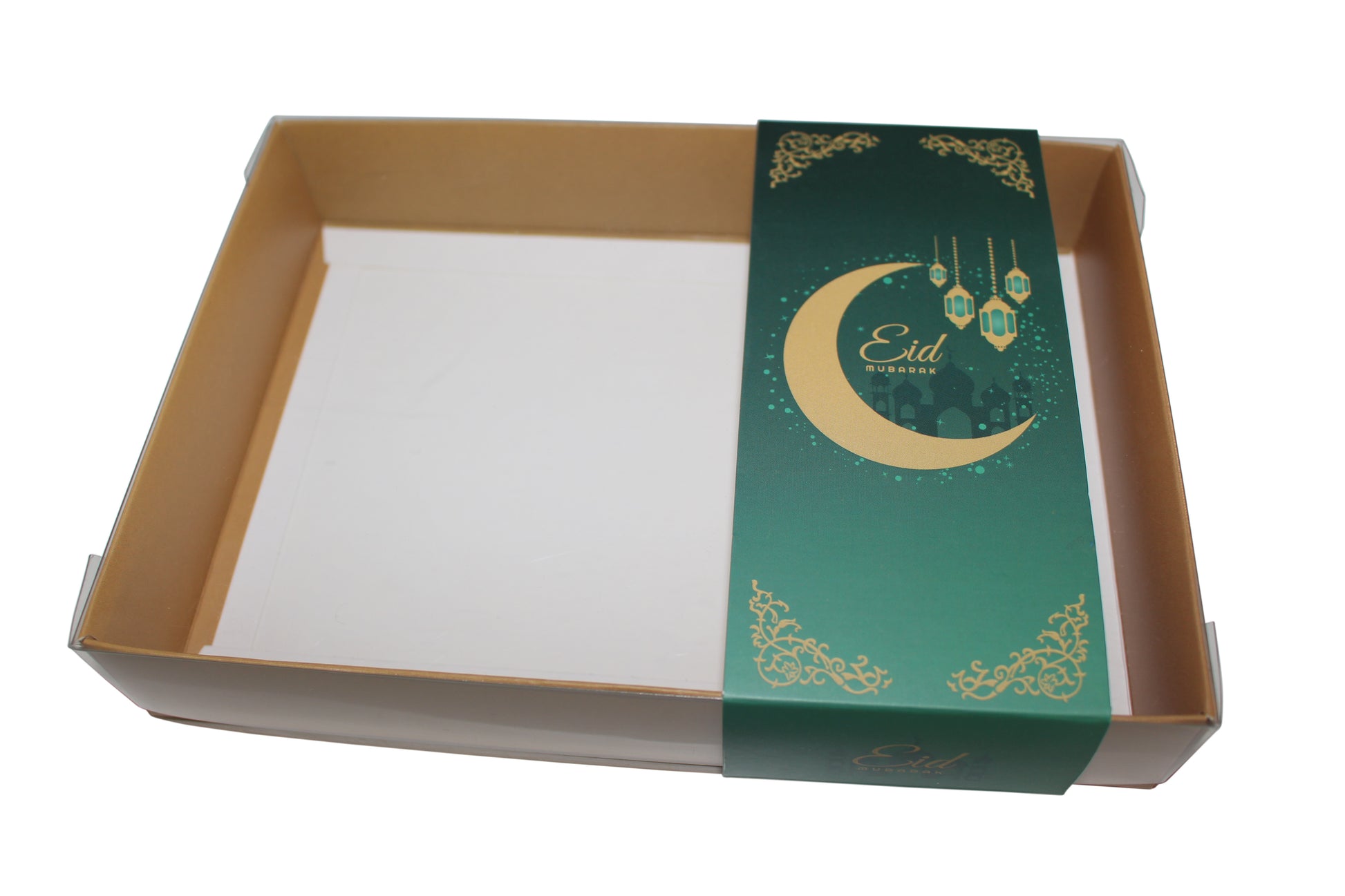 Discover our Clear Lid Box adorned with a Green Eid Mubarak sleeve 🕌, an exquisite packaging option that adds a touch of sophistication to your festive celebrations.