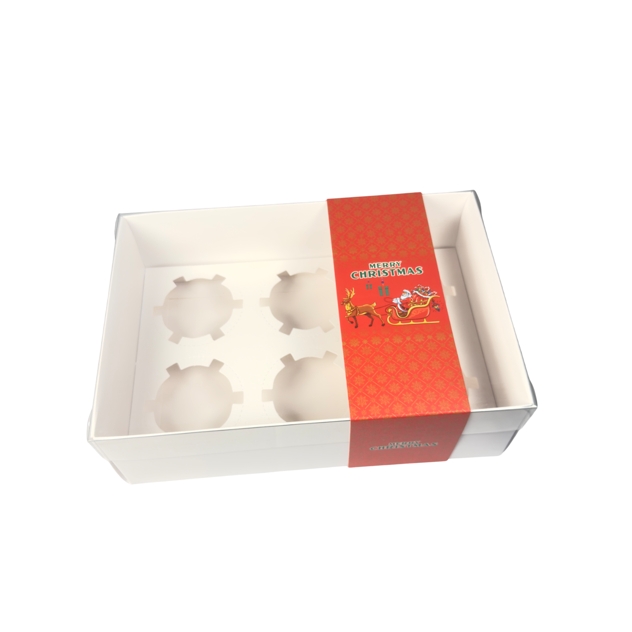Add a festive touch to your packaging with our exclusive Clear Lid White Box, featuring a unique Red Santa Christmas sleeve, available only at Sweet Treats Packaging.