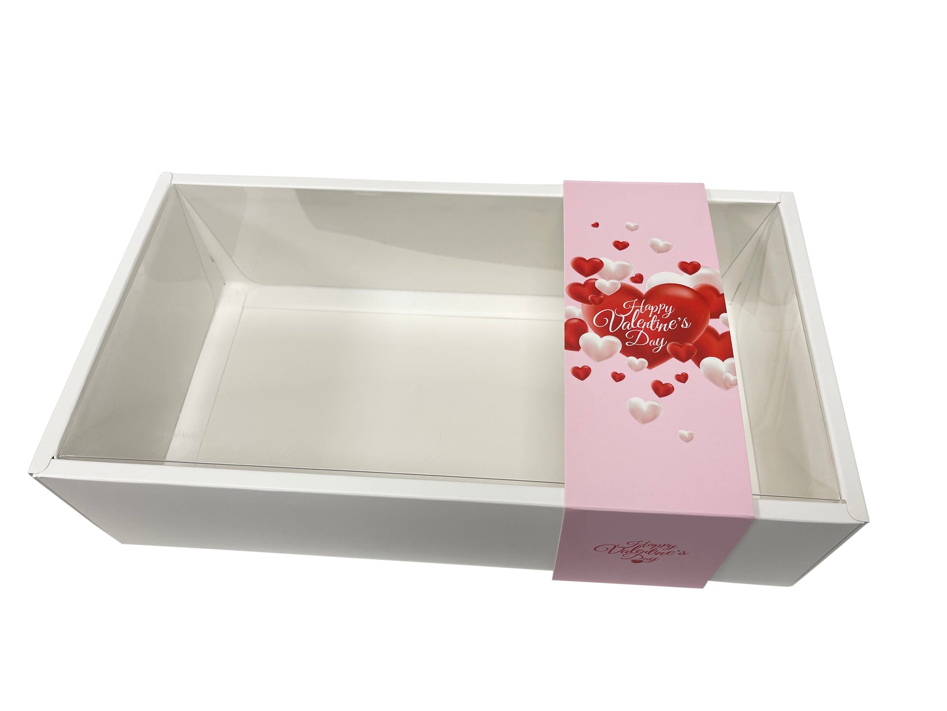 Please note, the pictures provided are for illustration purposes only, demonstrating the potential of your presentation. Elevate your Valentine's Day gifting experience with the exclusive Large Clear Lid Border Box featuring a Pink Valentine's Sleeve from Sweet Treats Packaging.