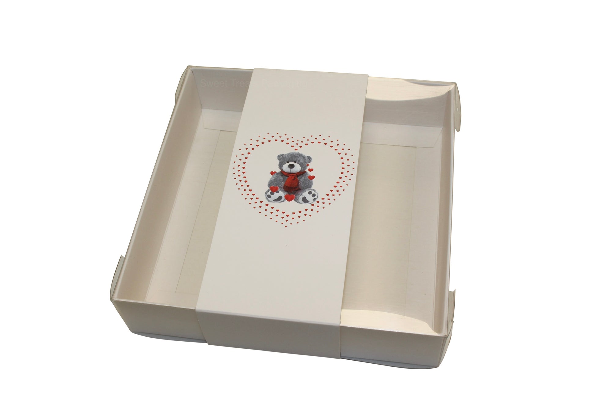 Please note, the pictures provided are for illustration purposes only, showcasing the potential of your presentation. Elevate your gift-giving experience with the exclusive Clear Lid Box featuring a Valentine Heart & Teddy Sleeve from Sweet Treats Packaging.