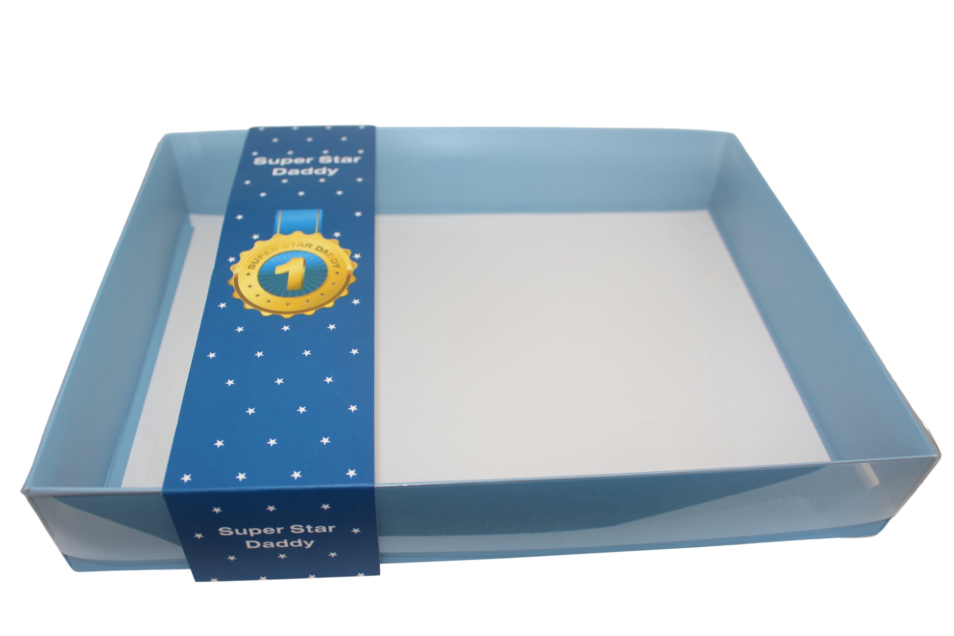 Our Clear Lid Box with a Blue Super Star Daddy Sleeve is the perfect way to show dad you care. Constructed from food-safe card and designed in exclusive Sweet Treats Packaging styles, the lid is completely removable and the box comes in flat pack form. With its generous size of 30 x 22 x 5cm, you can treat dad to something special this Father's Day. Available in Blue or White box colours.