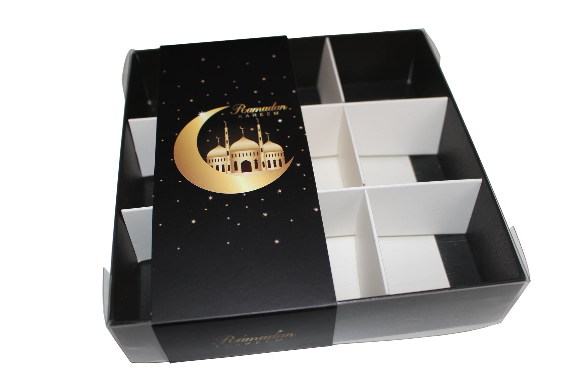Introducing our Clear Lid Box adorned with a sophisticated Black and Gold Ramadan Kareem sleeve, a distinguished addition to your festive presentations.