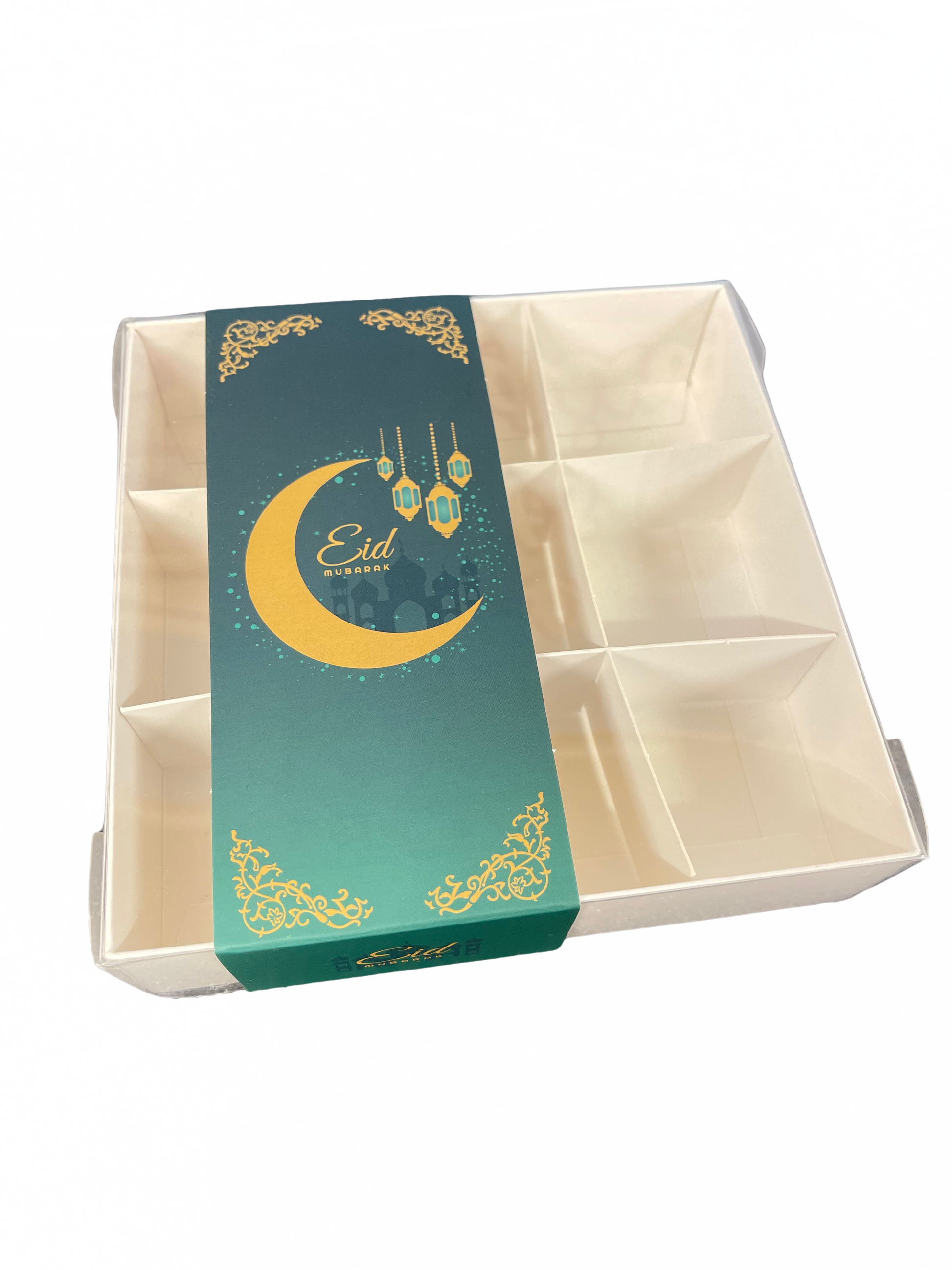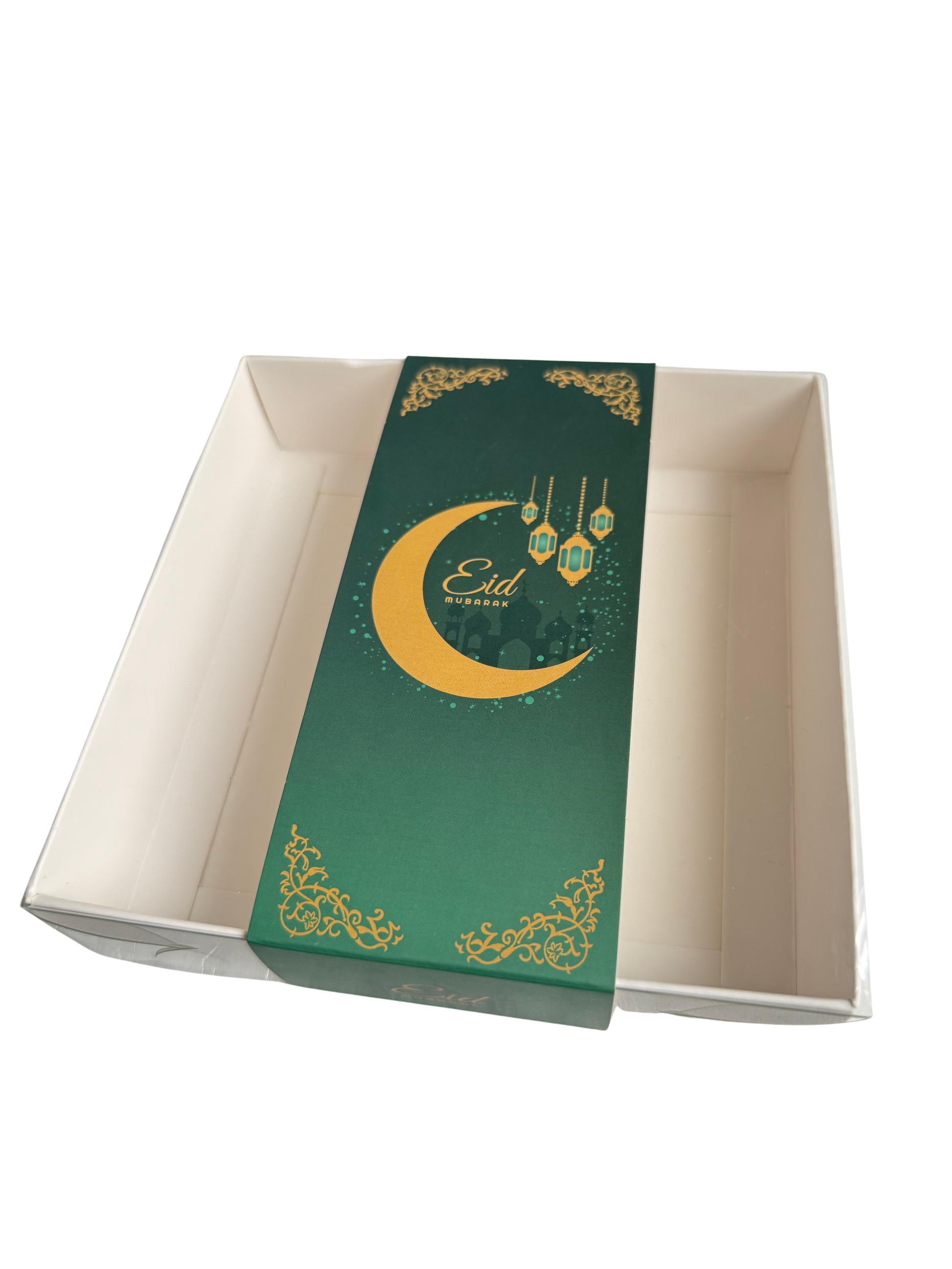Introducing our Clear Lid White Box with a beautiful Green Eid Mubarak sleeve, a sophisticated addition to your festive presentations.