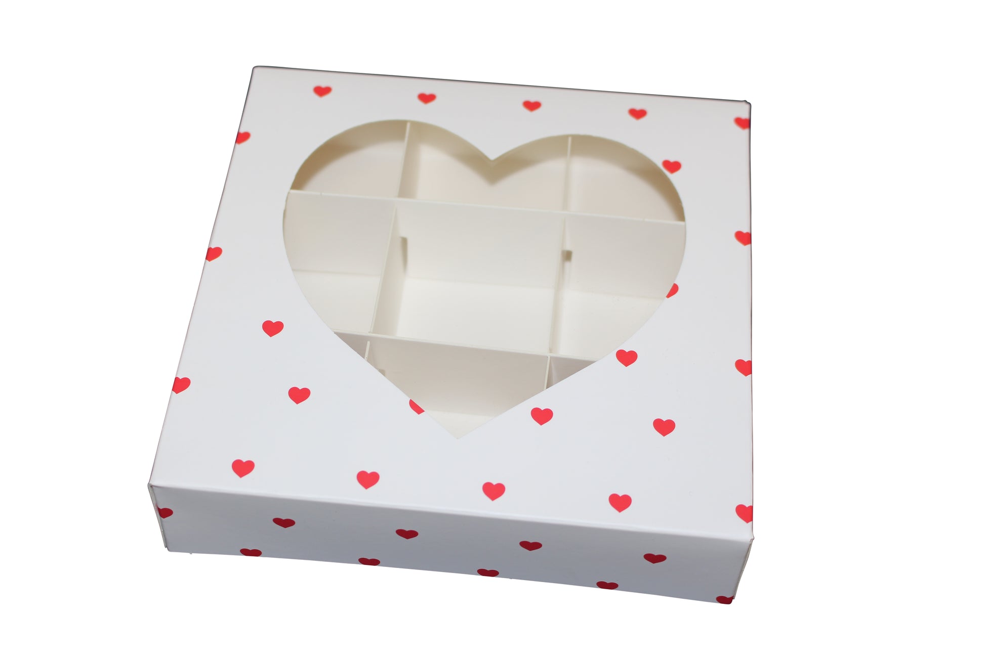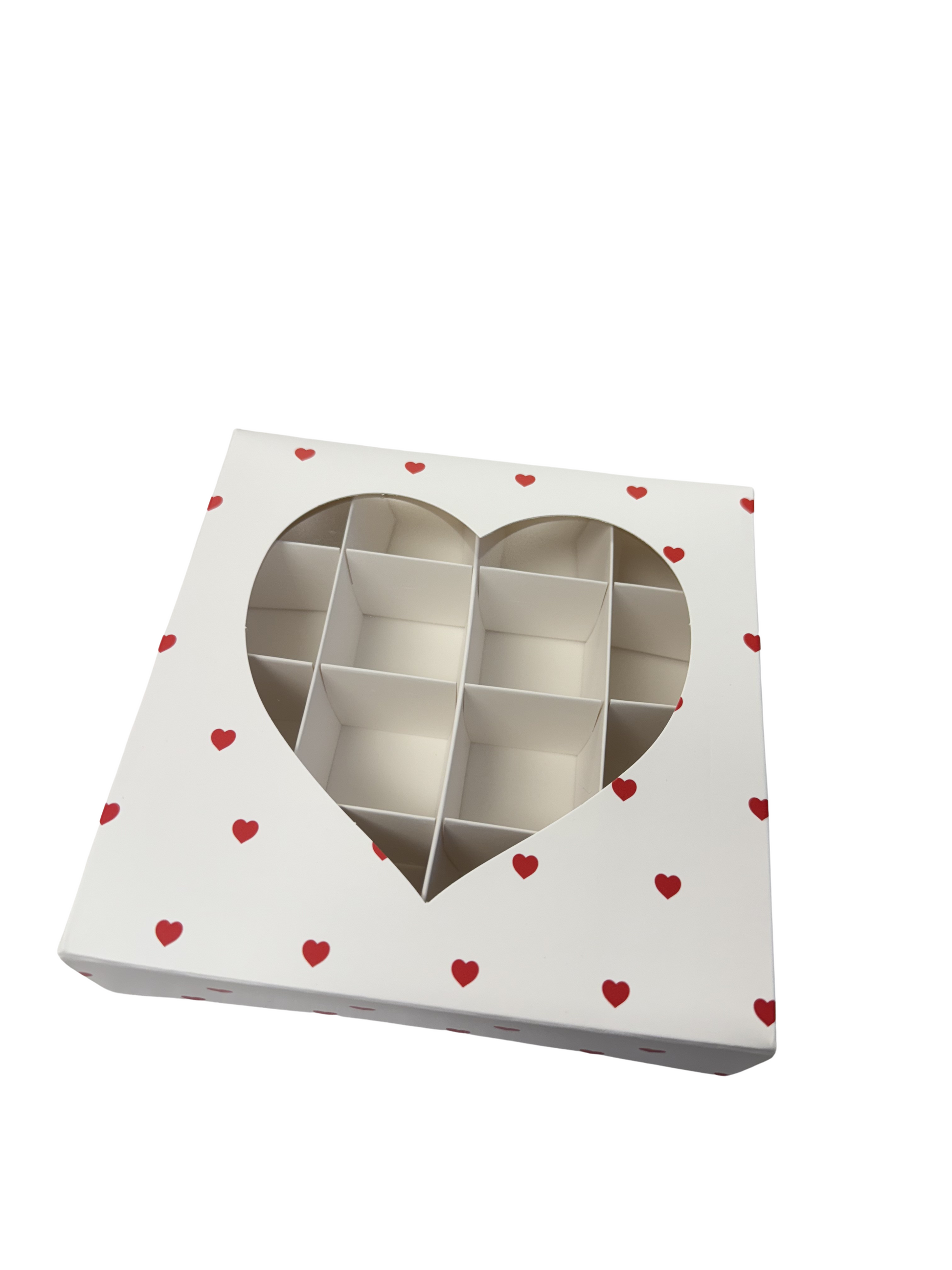 Exclusively offered by Sweet Treats Packaging, our Heart Window Box in the dimensions of 15x15x3.5cm features charming small red hearts around its transparent window.