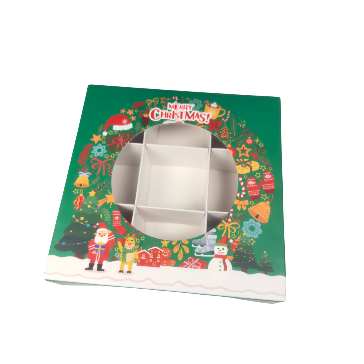 Spread holiday cheer with our Green Christmas Festive Box, a versatile and joyful packaging option that captures the essence of the Christmas season. This lively green box features a round window surrounded by an array of festive designs, including snowmen, Santas, Christmas trees, and decorations, creating a vibrant and engaging display for your treats and gifts.