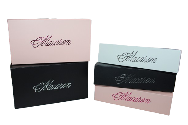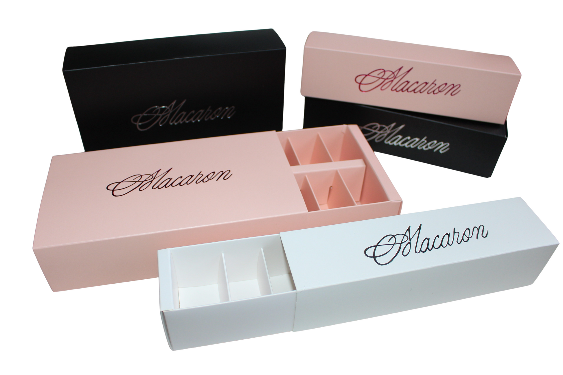 Each box features a luxurious sliding design that elegantly reveals the macarons inside. The top of every box is adorned with the word "Macaron" in foil calligraphy, adding a premium touch to your packaging. Whether for gifting or display, these boxes are ideal for presenting your macarons in a stylish and sophisticated way.