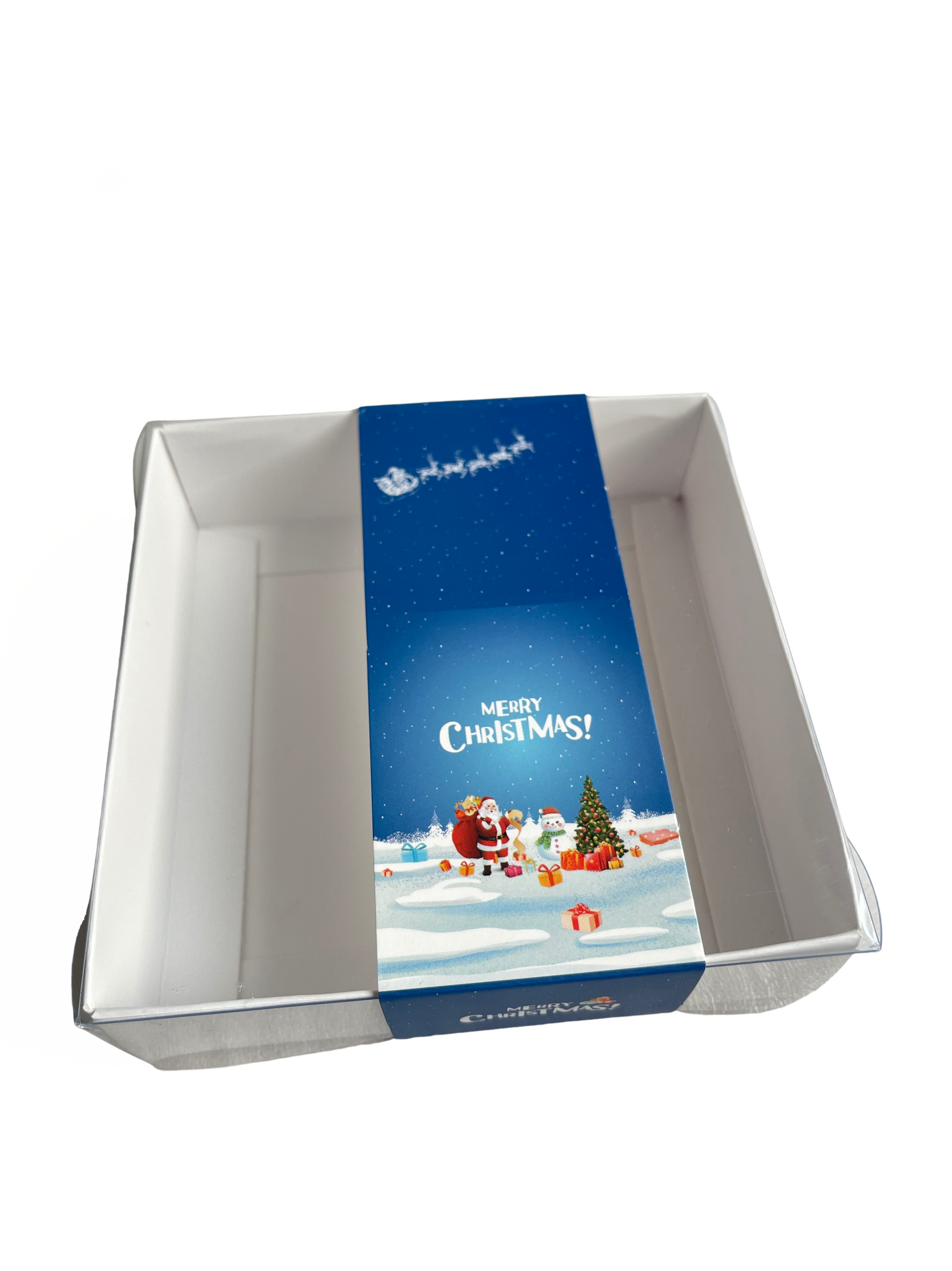 Get into the holiday spirit with our Clear Lid Boxes, featuring a festive Santa & Snowman 'Merry Christmas' sleeve. These boxes are perfect for showcasing and gifting seasonal treats, sweets, and baked goods, adding a joyful touch to your holiday packaging.